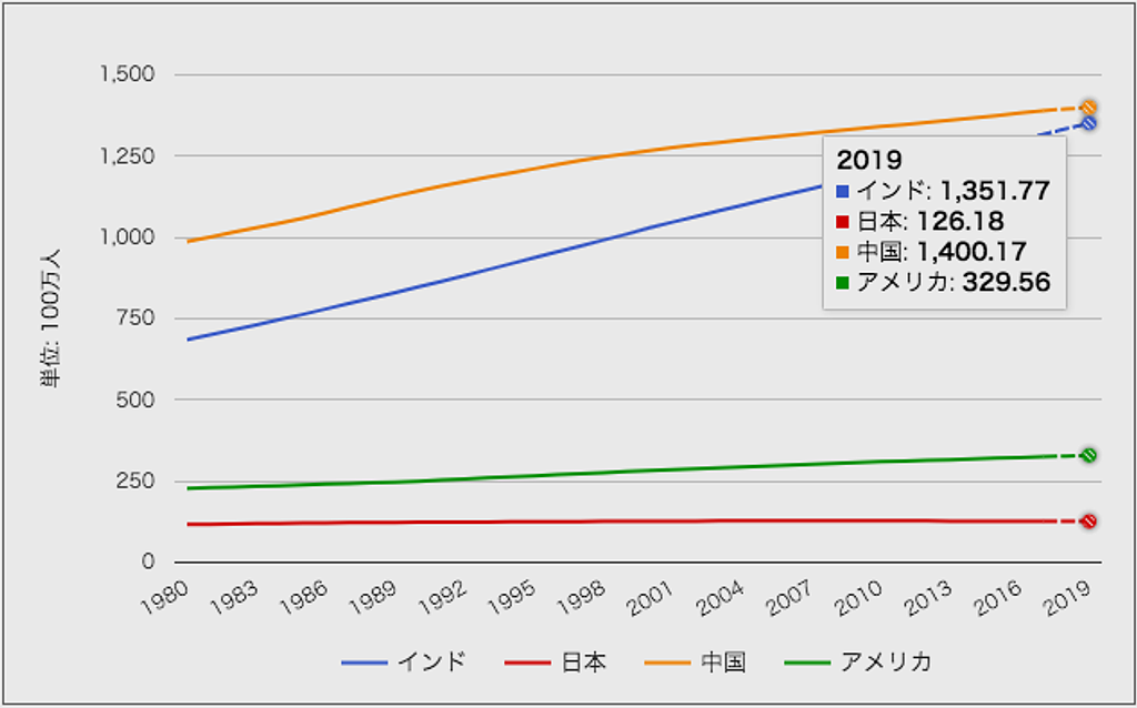 インドは世界最後の超大国と言われる国家であり、その人口は数年内に中国を追い抜き世界トップに躍り出ると予測されています。2018年時点での人口は13億人で(日本の10倍以上)、2050年には17億人に達すると予測されています。