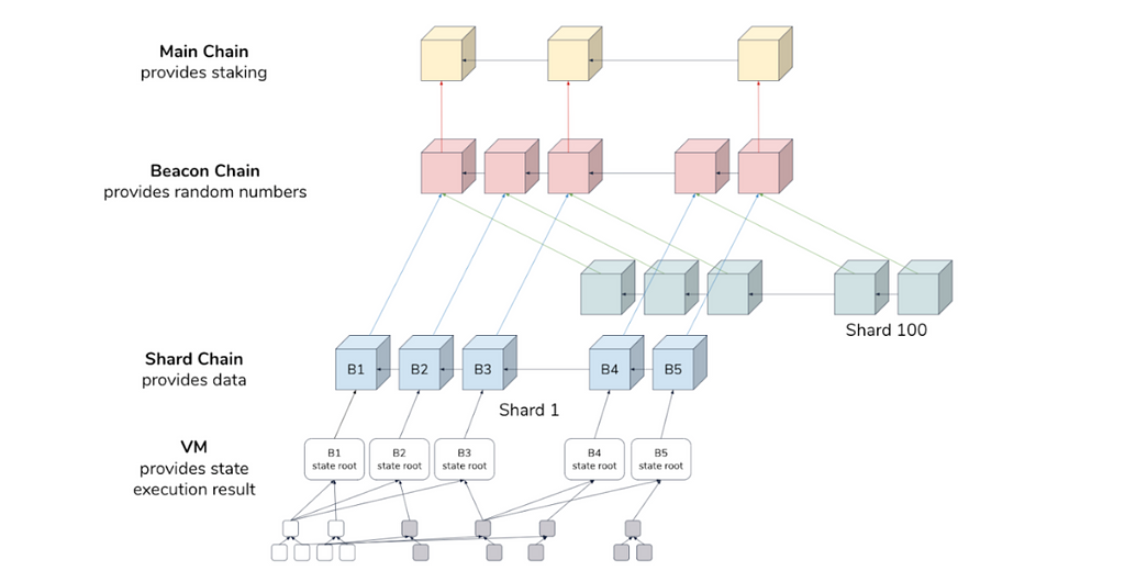 Ethereumのスケーリングを劇的に改善する手法としてシャーディングを実装します。シャーディングとは、シャード(Shard)ごとに個々のデータを分け、効率的に並列処理する仕組みを指します。1つのブロックチェーンではなく分離した複数のShard Chainがそれぞれトランザクション、ステートを管理します。