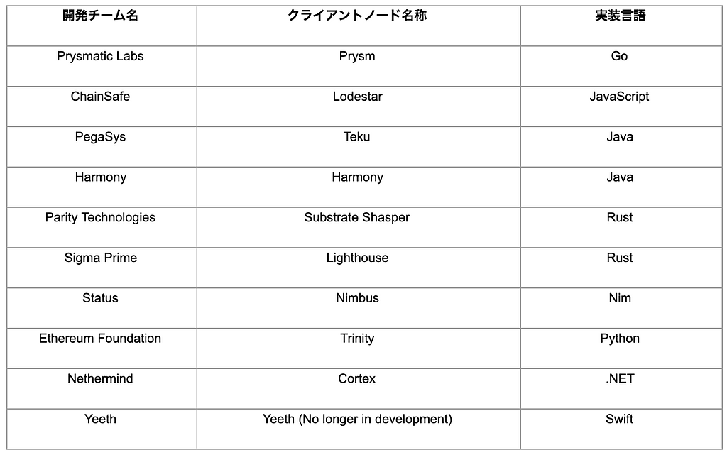 なお蛇足ですが、すべてのクライアントはオープンソースのため収益は生まれないので、各開発チームはEthereum Foundationからグラントを受け取っているか、別の営利事業を行っている場合が多いです。