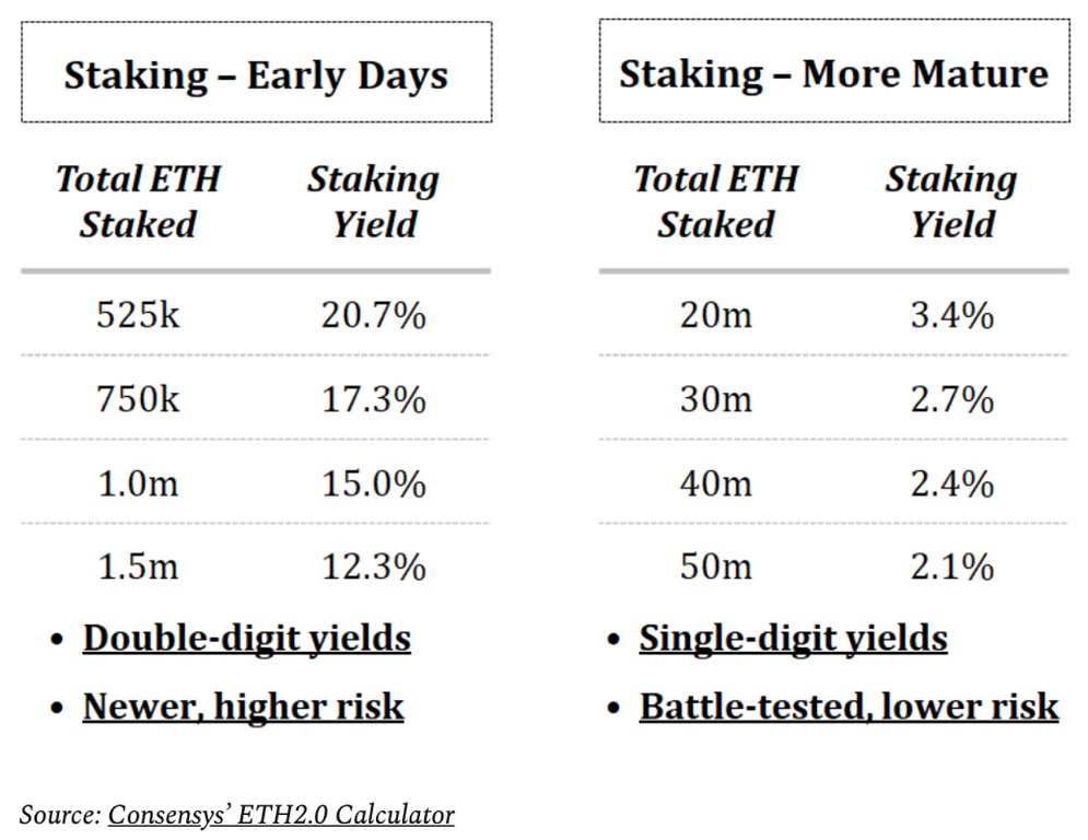 現在でもBlockFiなどのレンディングサービスでBitcoinを貸し出したり、CompoundでETHを貸し出すことで利子は得られますが、これにはレンディングサービスのカウンターパーティーリスクを受け入れる必要があります。しかしETHをステーキングする際には、カウンターパーティーリスクはありません。PoS移行後も、ETHは引き続きコードのデプロイやトランザクションの実行に必要であるため、実際には石油的な性質と債券的な性質の両方を合わせもつことになるでしょう。