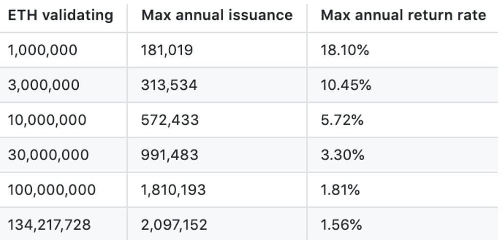 報酬の仕組みとしては、ステーキングされているETHの総量とリワード率(≠インフレ率)が反比例します。ネットワーク全体でステークされるETHの数が増えれば増えるほど、1バリデーターノードへのリワード率は減っていく仕様になっています。ノードの数が少ない時には報酬率が高く、ノードの参加を促す仕組みになっています。逆に十分にバリデーターノードが稼働している場合は報酬を減らして、ネットワークの新規トークンのインフレーションを抑える仕組みになっています。