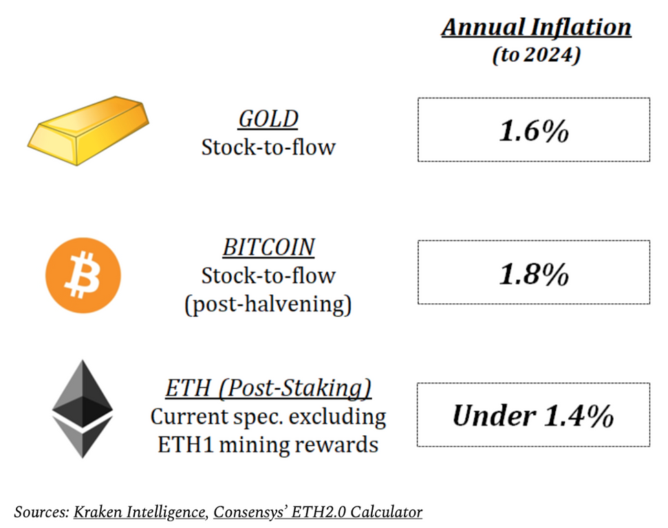 将来的に、ETHがネットワーク内で十分にステーキングされるとステーキング報酬は2.1%程度になり、ネットワーク全体でのインフレーション率は1.5%以下になります。1.5%のインフレーション率とは、金やBitcoinよりも年間で採掘される量が少ないということです。