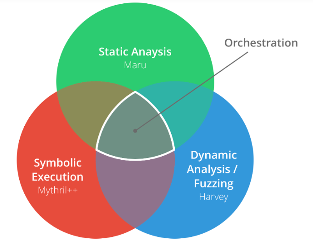 MythX(https://mythx.io/)はConsenSys社の提供するスマートコントラクトのためのセキュリティSaaSツールです。スマートコントラクトアナライザーであるMythrilを作成したメンバーによって開発された新ツールで、脆弱性のスキャンや分析などを提供する複数のコンポーネントから成り立っています。従来のスタンドアロンのセキュリティツールでは誤検出が散見されましたが、さまざまなコンポーネントを統合する複合分析技術によって正確な分析結果を得られるとのことです。例として、静的分析がシンボリック分析と連携し、その結果が動的分析に使用されることで、統合的な分析結果を提供します。