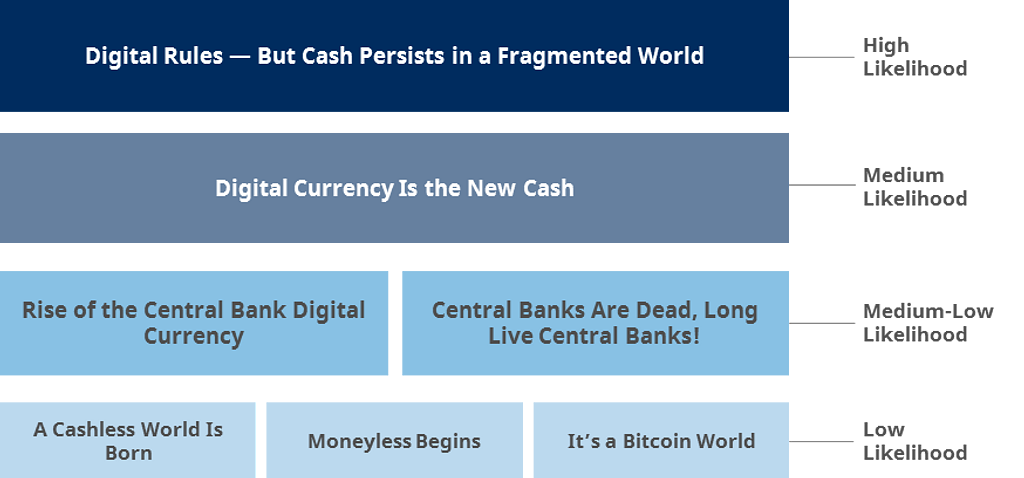 様々なシナリオが提示されていますが、可能性Lowと判断されているものは、確かに数年以内には実現しないor数年以後も実現しなさそうなものもありますが、この手のレポートからは「既存金融の中心地にいる人間が今マネーについてどう考えているのか」を読み取るのが重要だと思っており、それらのあり得なさそうなシナリオも本レポートには含めています。