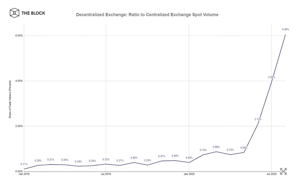 上記レポートでも解説したように、DEXの勢いはすでに中堅以下の取引所を取引高において大幅に引き離し、大手取引所にも迫っています。2020年8月30日には、取引高が最も多いDEXの一つであるUniswapの24時間取引量が、米国最大の取引所であるCoinbaseを上回りました。また、米メディアThe Blockによると、2020年8月の分散型取引所全体の取引ボリュームは中央集権型取引所全体の6%にまで迫っています。
