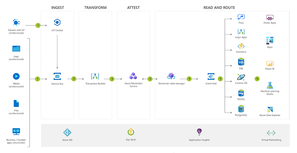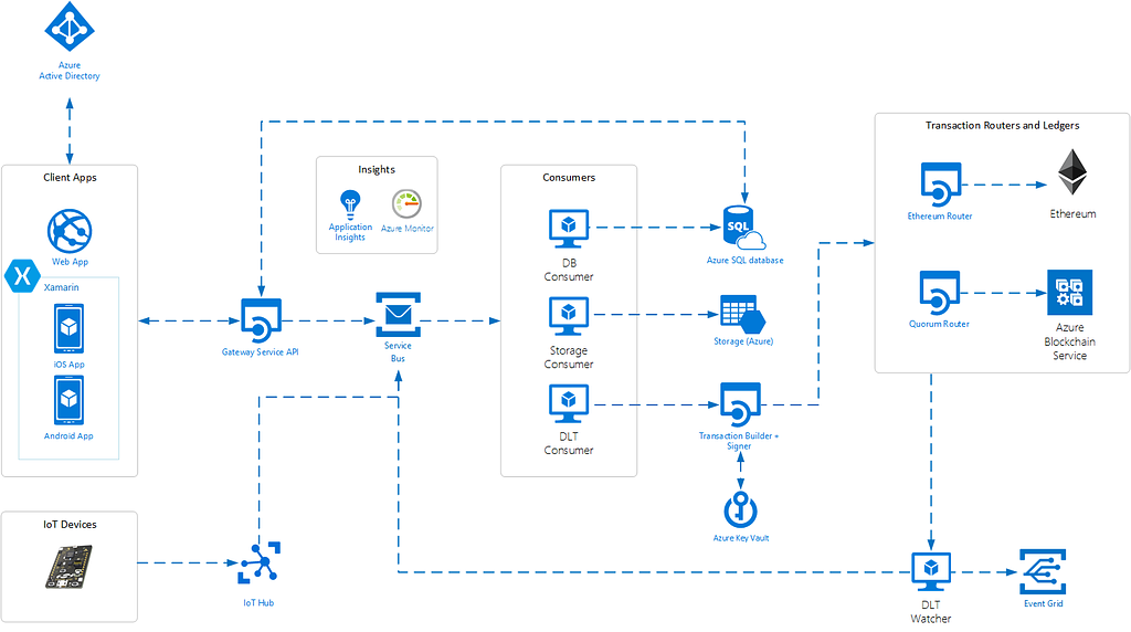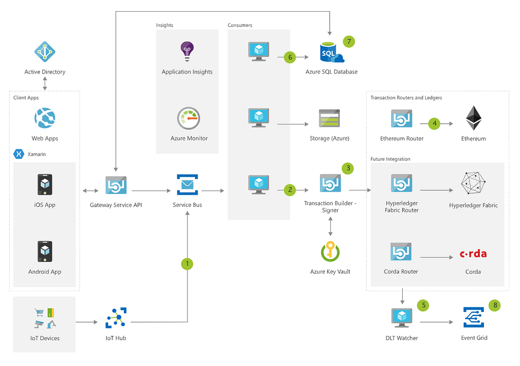 - 分散型台帳(DLT)コンシューマーがAzure Service Busからデータを取得し、トランザクションビルダーに送信します。