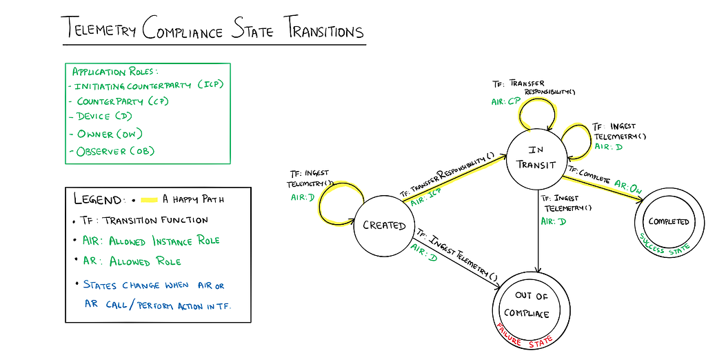 こちらはIoTを利用してサプライチェーン上の資産を監視するようなアプリケーションのアーキテクチャになります。例えば、食品や薬剤などの傷みやすい商品の冷蔵輸送が典型的なユースケースです。このシナリオでは、サプライチェーン上で遵守しなければならない契約条件(湿度や温度など)を依頼元の企業(小売店など)が指定します。いずれかのポイントでIoTデバイスによって範囲外の温度または湿度が検知されると、スマートコントラクトの状態が更新され、コンプライアンスが遵守されていないことがブロックチェーンを通じて即座に関係者に伝達されます。また、イベントをトリガーにして必要な処理を自動実行することも可能です。