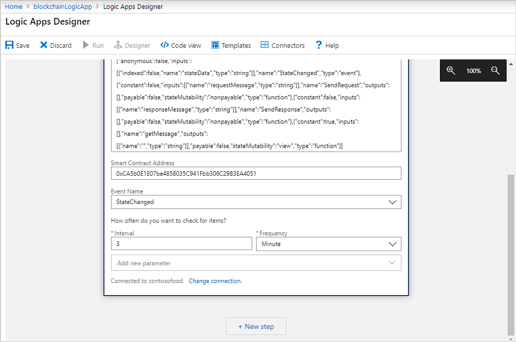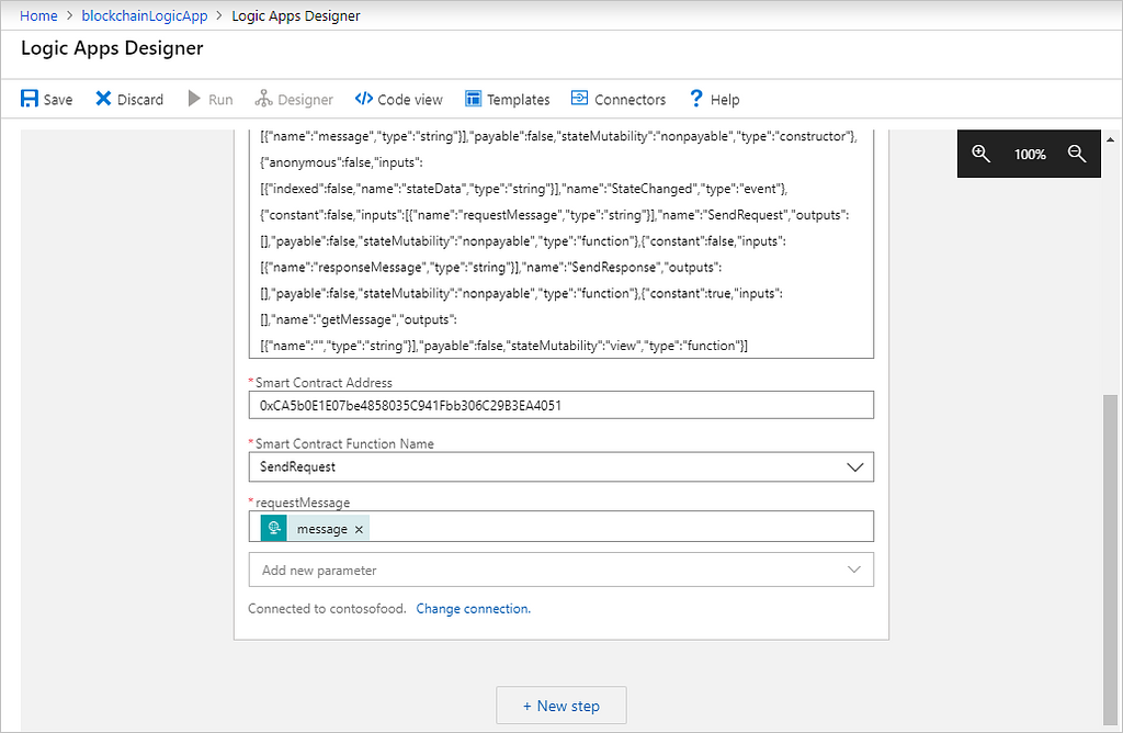 さらに、Ethereumブロックチェーンコネクタで用意されているアクションを使用することで、Azure Logic Appsに特定のHTTPリクエストが来たときにスマートコントラクトのメソッドを呼び出すマイクロサービスを作成することができます。
