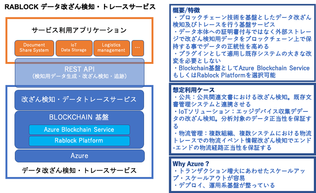 ラブロック株式会社ではブロックチェーン技術を基盤としたデータ改ざん検知及びトレースを行う基盤サービスを提供しています。本サービスのユースケースとしては公共関連文書やIoTにおける収集データ、物流におけるトレーサビリティのイベント情報などの改ざん検知が想定されています。また、ブロックチェーン基盤はAzure Blockchain ServiceもしくはRablock Platformを選択できるようになっています。