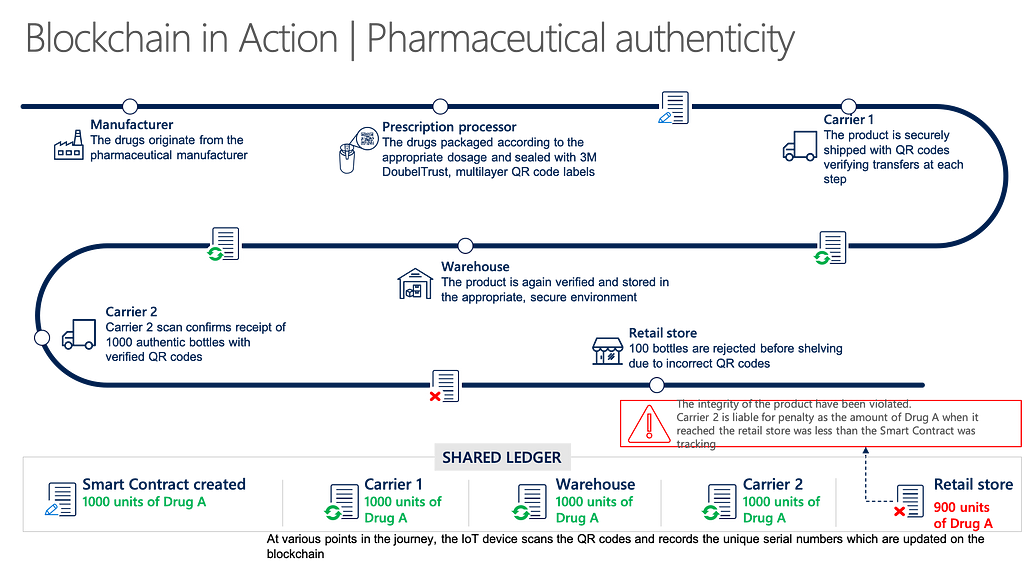 3Mでは偽造医薬品対策として、改ざん防止ラベルとブロックチェーンを組み合わせてサプライチェーン上の医薬品を追跡するサービスを構築しており、Azure Blockchain Workbenchを利用しています。