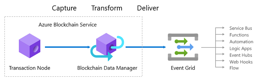 ブロックチェーンデータマネージャーとは、Azure Blockchain Serviceのトランザクションやブロックのキャプチャ、変換、配信を行うツールで、ブロックチェーンと他のAzureサービス群を連携・統合することができます。