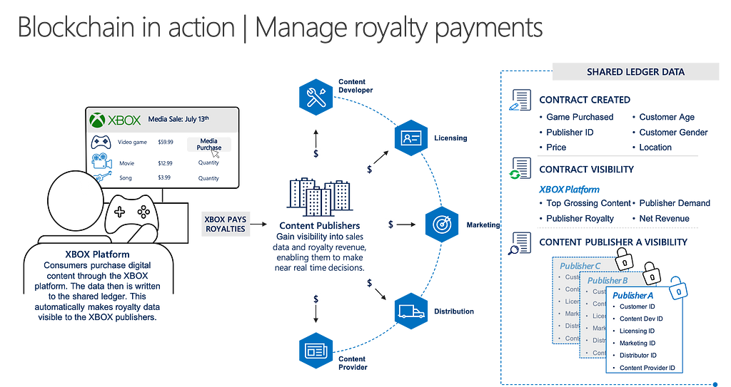 - 一般の消費者がXBOXプラットフォームを通じてデジタルコンテンツを購入すると、その情報が共通のブロックチェーンに書き込まれてゲーム開発会社と共有される。