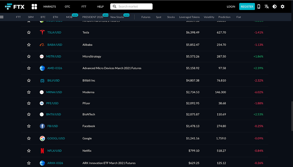 FTXは2020年10月にTokenized Stocks(トークン化された株式の取引)を開始しました。TeslaやApple、Amazon、Facebook、アメリカ以外の株式ではAlibabaやNio等の中国株を揃え、世界での高い需要が見込まれる株式を数十程度上場させています。(2020年12月時点)それぞれのトークン化された株式は現物市場と先物市場が用意されています。