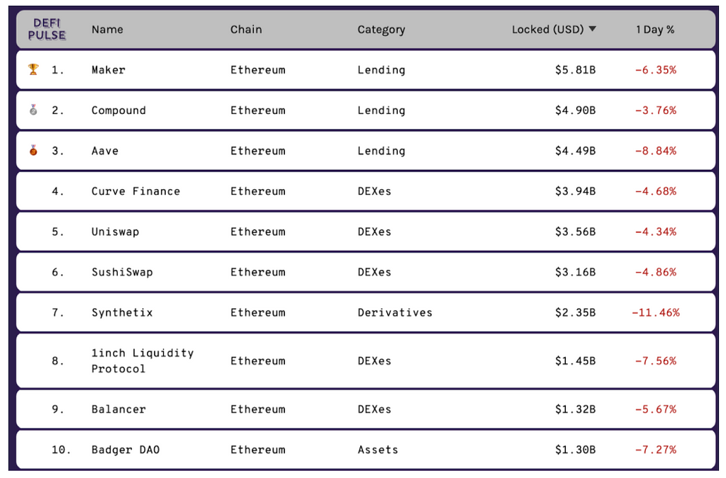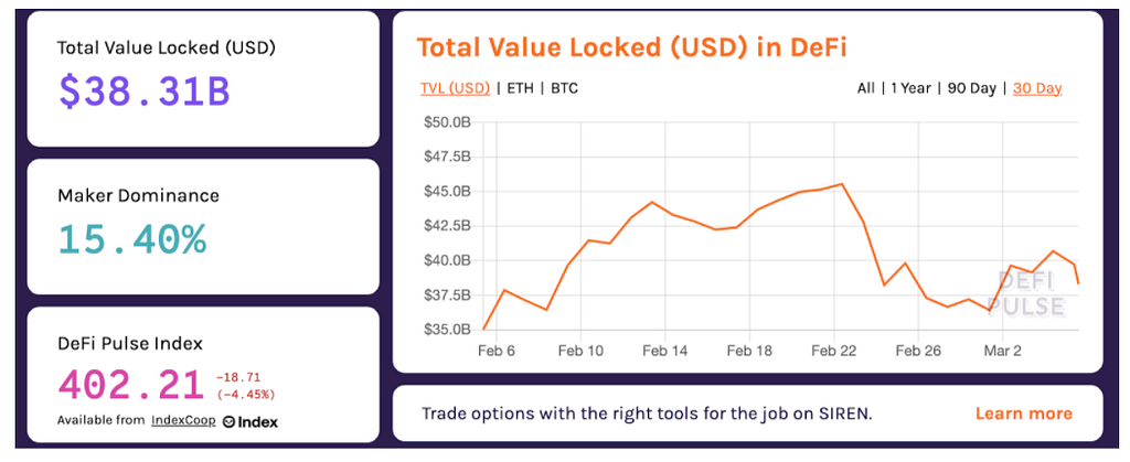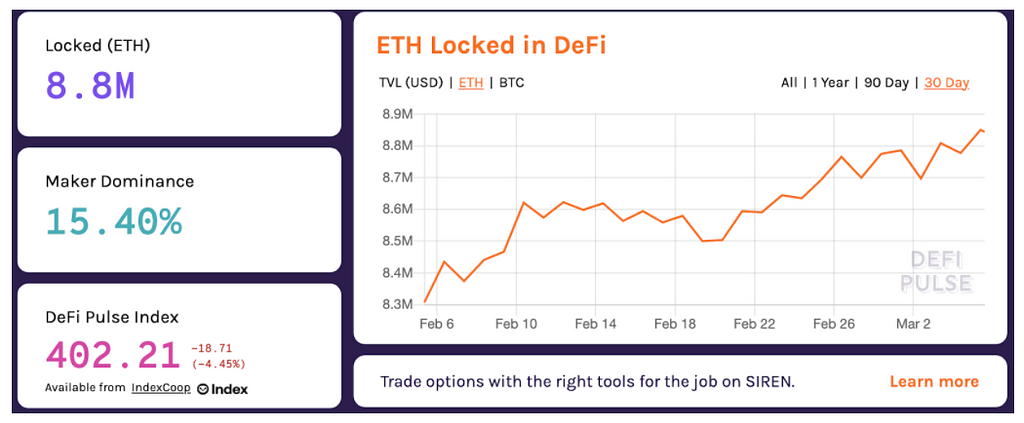 TVLが受ける暗号資産価格変動の影響を可能な限り排除したい場合、DeFi Pulse上でUSD建てではなくETH建てかBTC建ての表記に切り替えることでUSD建てとはまた違ったデータを確認できます。