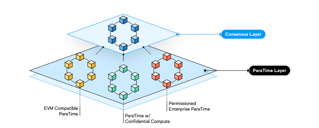 Oasis NetworkはProof of Stake(PoS)で稼働するブロックチェーンで、Consensus LayerとPraTime Layerの二層構造になっている点に特徴があります。合意形成を取りまとめるレイヤーは複数のバリデーターによって検証されるPoS型のネットワークでスケーラブルになっており、ParaTime LayerはConsensus Layerとは分離され、並列で計算処理を行える構造になっています。