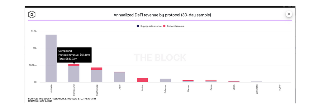 下図は2021年4月3日~2021年5月3日の期間で、各プロトコルが得た収益です(流動性提供者の収益込み)。