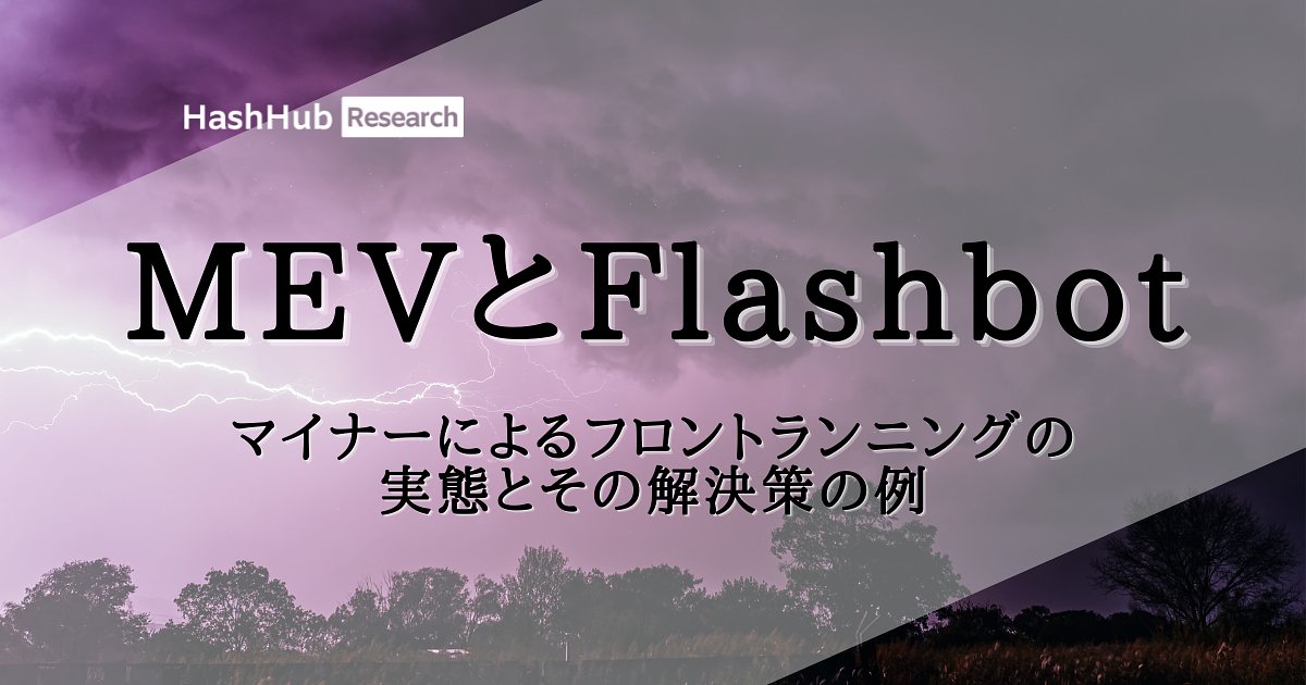 本レポートではMiner Extractable Value(以下MEV)とFlashbotの概要を解説します。MEVは「マイナーが抜き取れる利益」のことで、主にEthereumのマイナーが自身のコントロール下にある事柄を利用することで、マイニング報酬とは別に利益を追求できる事象を指します。ここでいうところの「コントロール下にある事象」とはどの未承認トランザクションをどのような順番でブロックに格納し、自身でどのようなトランザクションを生成するかであり、利益の追求方法はフロントランニングやバックランニングを指しています。詳細は次節で説明しますが、この問題はEthereumの仕様に深く結びついているために根本的な対処が難しい上に、エンドユーザーが普段は触れることのない領域で実行されるために可視化が難しく、問題の把握が困難であるという問題を抱えています。