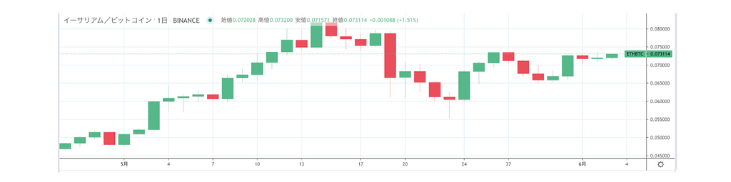 ※ETHの下落率が比較的小さく見えますがETHは5月に入ってからも大きく上昇していたためです。以下のチャート(ETH/BTC)の通り下落時にはBTC以上の下落を記録しています。