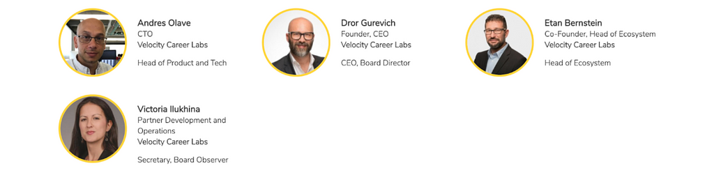 同プロジェクトの管理者は非営利団体であるVelocity Foundationです。分散型ネットワークの継続的なルールブック構築、プロトコル開発、アプリケーション、関連サービスの研究開発のサポート、オープンソース開発者コミュニティの育成を行います。Velocity FoundationはVelocity Career LabsのAndres Olave氏、Dror Gurevich氏、Etan Bernstein氏、Victoria llukhina氏を役員に迎え、ボードメンバーにはSAPやOracle、randstadを含むHRやEd-Tech、多国籍企業、雇用者、教育機関のような同市場における利害関係者13人(執筆時点)で構成されています。