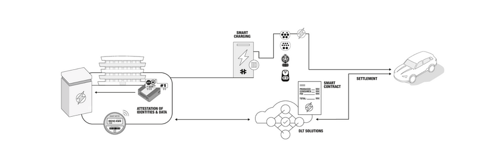 プロジェクトの最初のステップとしてデジタルIDを付与したEV充電器をネットワーク接続し、「充電データの安全な送信」「電気自動車の充電」「リアルタイム決済」を可能にしています。(上図表参照)