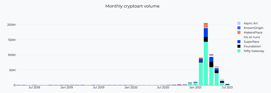上グラフは6月末までのNFTアートの販売量を示したものです。一目でそこに大きな山があることがわかるかと思いますが、これが2021年前半を颯爽と駆け抜けた「NFTバブルの残像」です。