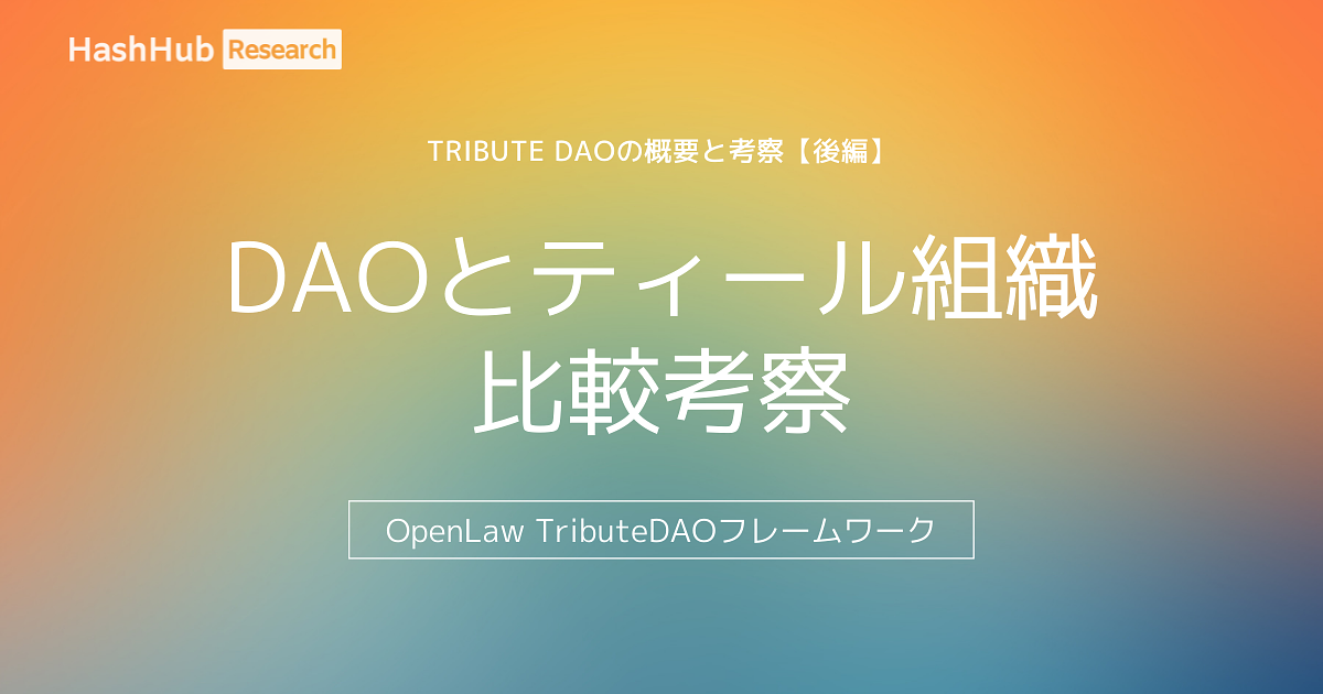 前回のレポートではOpenLaw TributeDAOフレームワークの概要解説とそのヒエラルキー構造の必要性考察を行いました。後編ではTribute DAOフレームワークを用いたDAO形態を事業モデルとして捉えた場合の優位性、具体的にはDAOとティール組織を比較してその如何を考察します。
