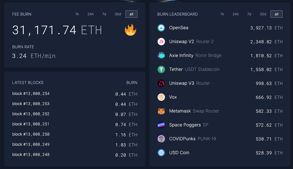 執筆時点ではNFT市場が活発化していることもあり、Openseaだけで約3,927ETH(全体で約31,171ETH)がバーンされており、DeFi関連と合わさり平均するとおよそ3.24ETH/分のペースでバーンされています。