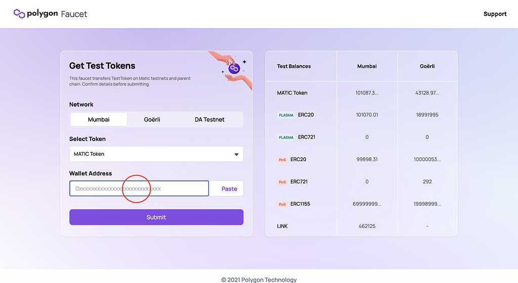 ウォレットアドレスをフォームに入力して”Submit”を押して成功すると、指定したアドレスに0.1MATICが送金されます。失敗する場合もありますが、何度か試していると送金できるので、繰り返し試してみてください。