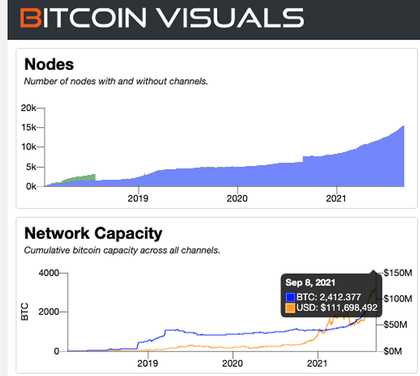PoSのステーキング以外に、特殊なジョブのノード運営をすることでインカムゲインを得る方法もあります。ここではBitcoinのLightning Networkを紹介します。2021年に入ってからLightning Network上のキャパシティは増え続けており、決済手段として少しずつ使われるようになってきています。