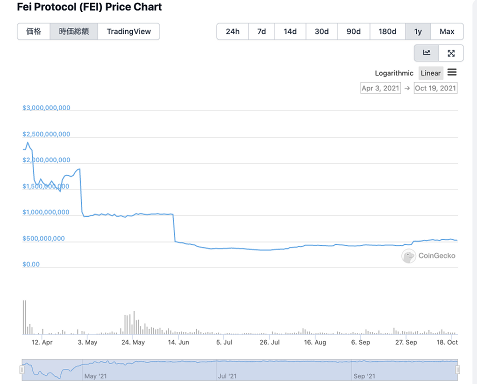 Fei Protocol自体はv1を2021年の春にローンチしており、当時はガバナンストークンのTRIBEをインセンティブにした大規模なローンチイベントが行われました。このローンチイベントで流通総額が一時的に膨れ上がりましたが、その後、ステーブルコインFeiの流通総額はおおよそ$500M程度で推移しています。