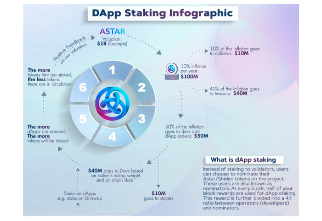 Astar Networkの毎ブロック報酬の半分がdAppsステーキングのためにアロケーションされます。ネイティブトークンASTR保有者はバリデーターをノミネートするだけでなく、DAppsのスマートコントラクトに対してノミネートすることができます。このノミネートされている量に応じてDApps開発者はブロック報酬を受取ることができます。毎ブロック新規で生成されるうちの半分がdAppsステーキングに割当されて、そのうち開発者とASTRをステーキングしたユーザーに4:1の割合で配られ、DAppsに対してノミネートをするユーザー側にもインセンティブがあります。