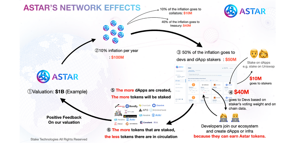 ステーキング報酬を求めて多くの開発者がプロダクトを作り、彼らがホルダーに対してステーキングを求めます。このステーキングにより多くのトークンがロックされると市場流通量が減り、トークン価格が上昇しやすくなります。このトークン価値を求めて更に開発者が入り、ステーキングを求めます。Astarではこのような好循環を目指しています。