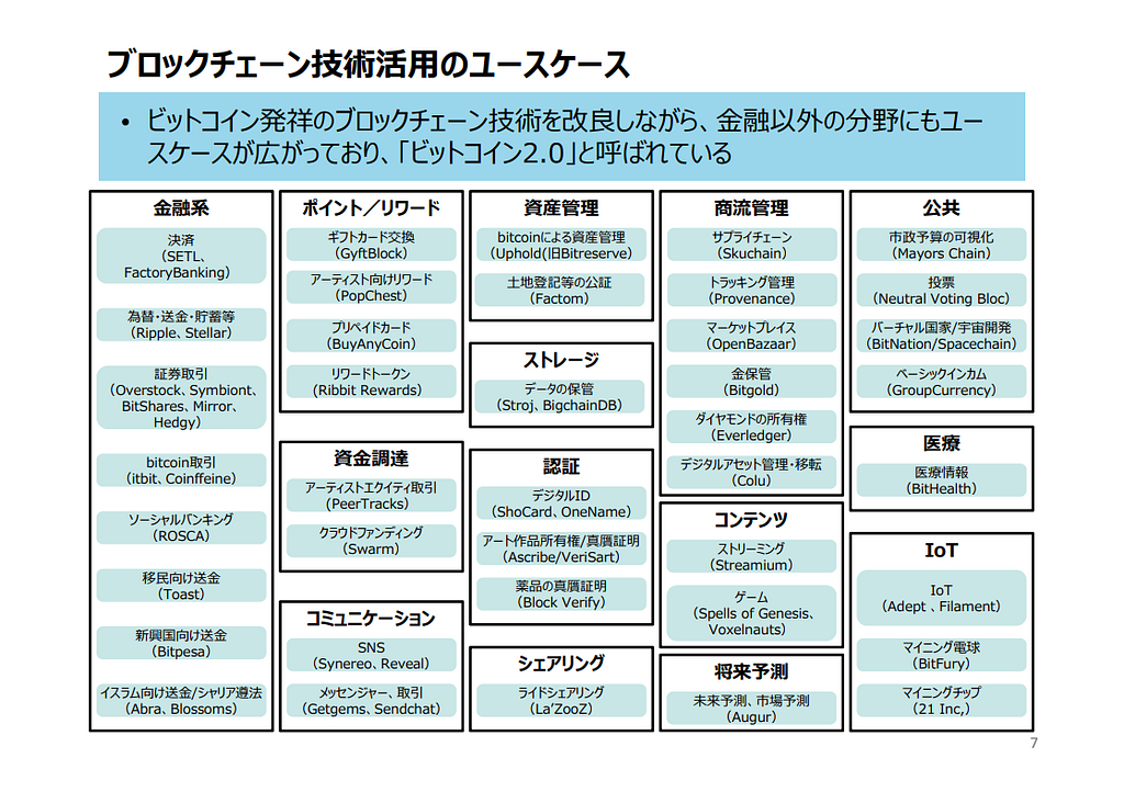 本レポートでは、ブロックチェーンの活用事例として挙げられていた各分野の現在の状況を確認しながら、今後国内企業でブロックチェーン事業を起こすならどの分野が適すかという仮説から考察をしていきます。