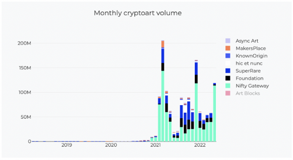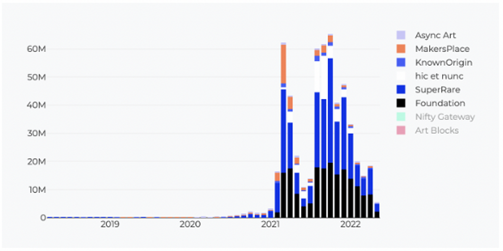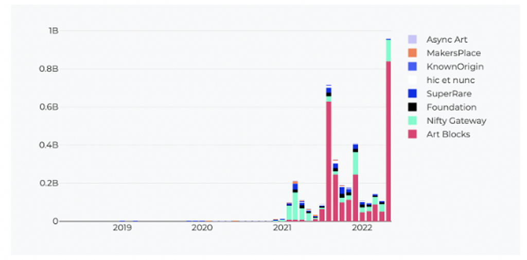 右端の値は記事執筆時点で5月の15日間の数値となります。4月まではどのプラットフォームも横ばいの傾向でしたが、ArtBlocksはMint機能のリニューアル、squigle コレクションの高額取引やヴェネチアビエンナーレに出展が決定したなどのポジティブなニュースが多く、取引額もその影響があったようです。Nifty Gatewayの躍進の理由はつかめていませんが、歴代トップクラスの結果を出せています。