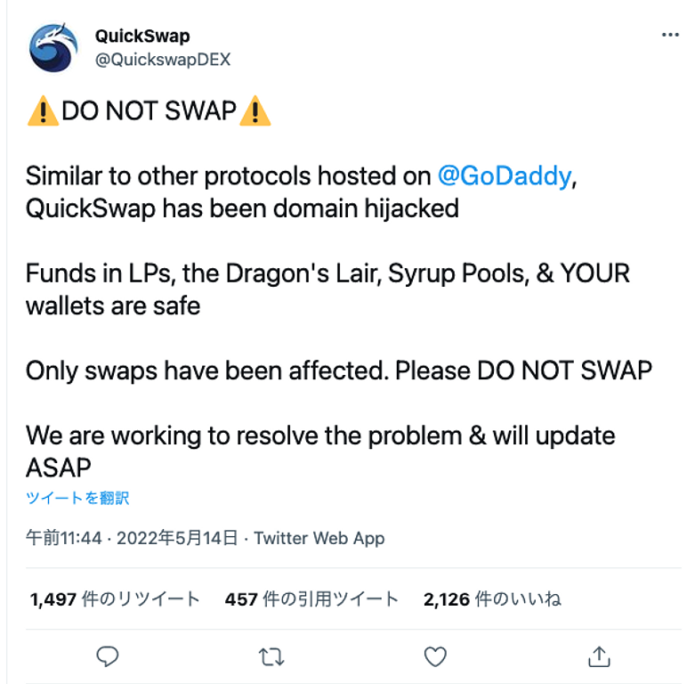 またQuickSwapなどの代表的なDEXではDNSの乗っ取りが発生しました。従来のDNSの置き換えでは、サイトは似せたまま悪意あるスマートコントラクトに置き換えすることがよくある手法でした。このようなDNSの置き換えは従来もある攻撃手段でしたが、今回は複数プロジェクトが対象になって同時多発的でした。これだけでも脅威ですが、今回はさらに高度化しています。