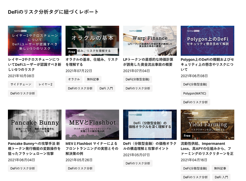 加えてDeFiプロジェクトの様々なハッキング事例や詳細を公開しているレポートも多々あり、タグから閲覧ができます。