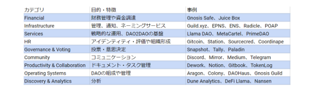 他、MediaはBankless、GrantsはGitcoin、Impactは環境やジェンダーの問題に取り組むDAOが挙げられています。