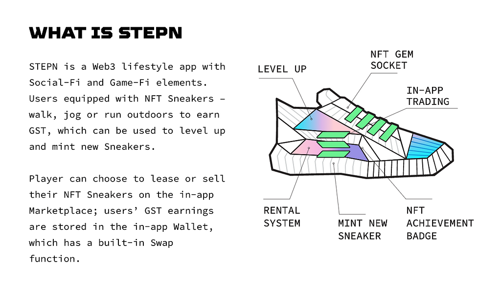 STEPNは「Move to Earn」をコンセプトにしたサービスで、ユーザーは靴のNFTを保有し歩いたり走ることで暗号資産を得ることができます。STEPNは自身をSocial-FiとGame-Fiの要素を加えたweb3ライススタイルアプリケーションとして定義しています。