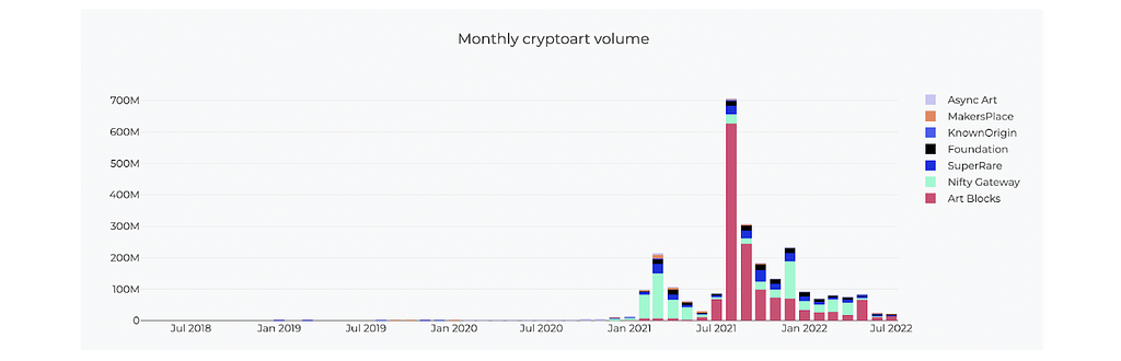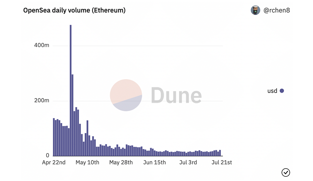 Art系のNFTマーケットプレースに比較すればまだまだ2021年2月の数倍のボリュームがあり、健闘しているといえるでしょう。6月、7月のボリュームは大まかには変動はなく、底堅い印象も受けます。草の根のNFTコレクションなどの発表は途絶えることもなく、そういった形で支えられている姿が数字となって現れています。