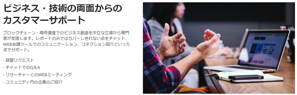 HashHubリサーチでは法人プランを通して累計で70以上の法人をサポートしており、各企業の課題と解決策を通して多くの知見が集まっています。この界隈はスピード感が非常に速いために最新動向の把握に苦労している企業が多く、レポートを通してその情報提供と、集合知を使った壁打ちでビジネスプランや課題の解決を行っています。
