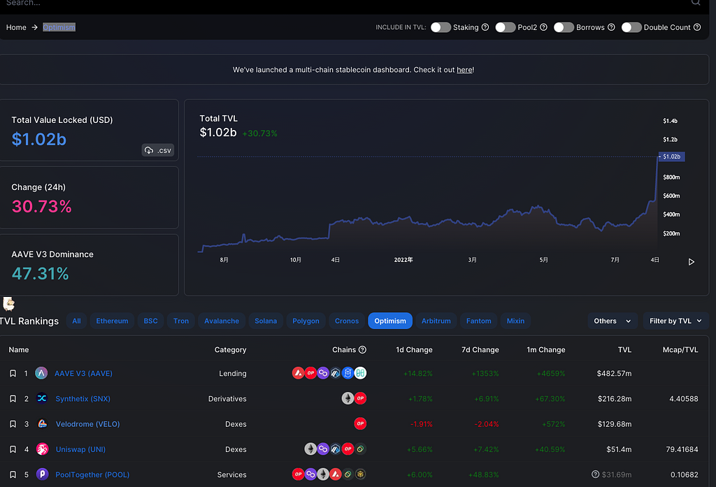2022年7月から8月にかけてOptimismのエコシステムは急速に成長しており、ネットワーク全体のTVLは$1Bを超えました。Velodromeはその中でTVLランキングでは3位で、分散型取引所の分野では1位となり、Uniswapを超えるプロジェクトとなっています。