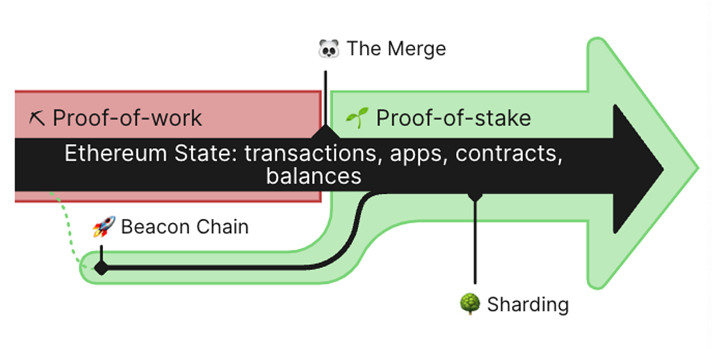 まずThe Mergeについておさらいすると、Ethereumの現状の実行レイヤーであるPoW(Proof of Work)と新しいコンセンサスレイヤーでPoS(Proof of Stake)で動いているBeacon ChainをMerge(結合)するステップです。