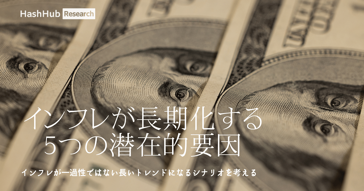 5-10年の視野(ざっくりそのくらいのある程度長い期間、という程度のニュアンスで捉えて欲しい)でインフレが続く可能性があり、それはなぜか?という論点について述べていきます。暗号資産に投資をしている市場参加者は20-40代が多く、ほとんどが投資経験は長くて10年ちょっと、つまり金融緩和の時代しか経験していません。もしインフレと利上げが続くのであれば、市場に向き合うメンタルモデルも大きな変化が迫られるであろうとも考えています。