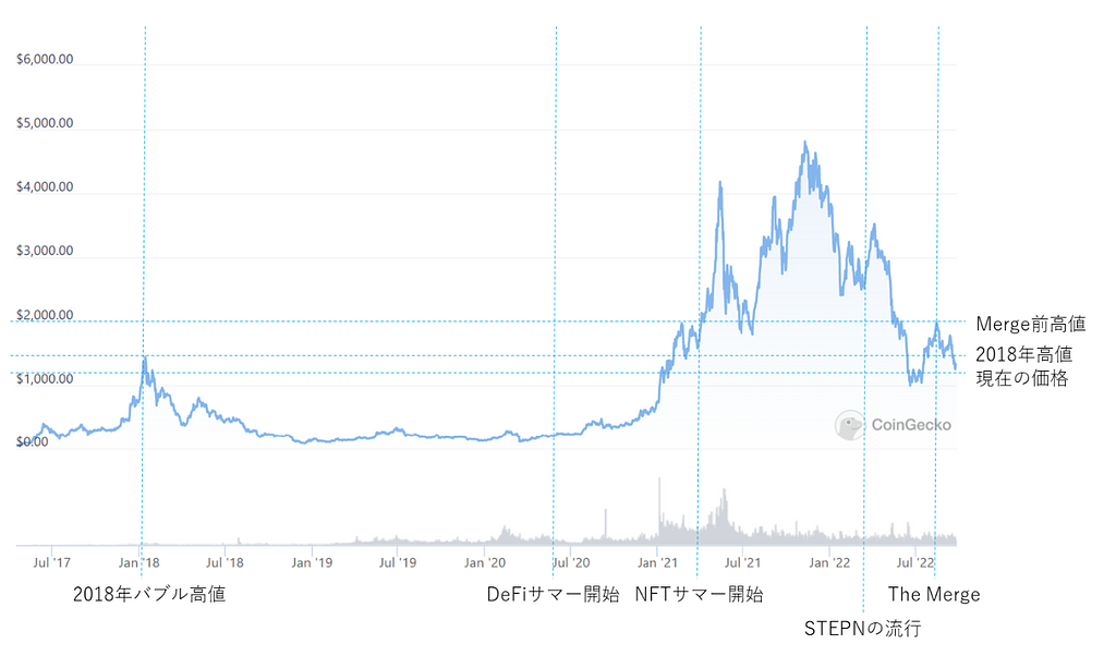本レポートでは、今後に来る可能性のあるトレンドの種は何かという視点で、現状出ているプロジェクトを網羅的にまとめます。2022年9月末時点で暗号資産は下落傾向にあり、ETH価格への期待が持たれていたThe Mergeの影響も、2022年8月14日の約$2,000を頂点にしてその後下落しています。