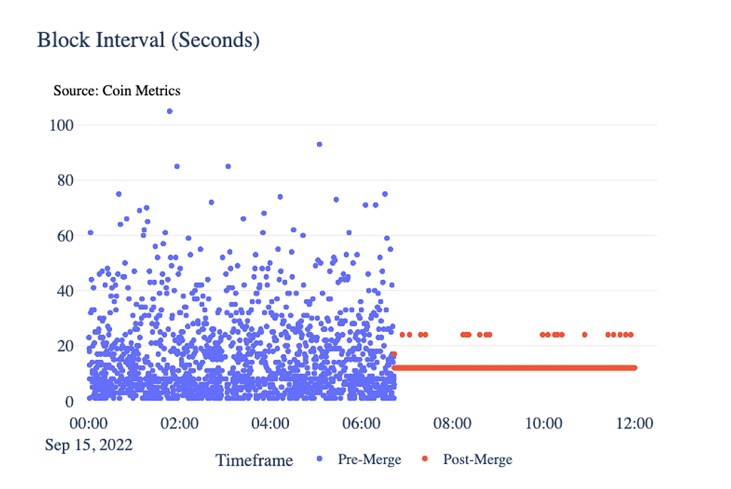 The Mergeによって、ブロック生成から計算を解くプロセスがなくなったため、ブロック生成間隔が安定化しました。ブロック毎に常に約12秒の間隔になったためUXが改善しました。また、この安定化は間接的にgas fee改善にも多少繋がるとも言われています。ブロック間隔が分からず高いトランザクション手数料を支払うユーザーが、一定少なくなるためです。