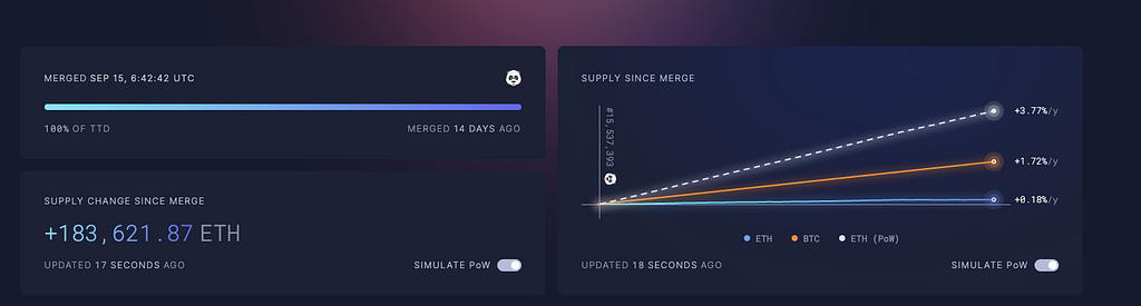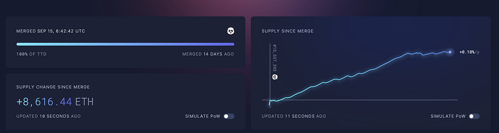 The Merge後、PoW報酬がゼロになり、新規発行がPoS報酬のみに限定されます。EIP-1559によりネットワーク使用量に応じてバーンもされることから場合によってETHはデフレーションされます。