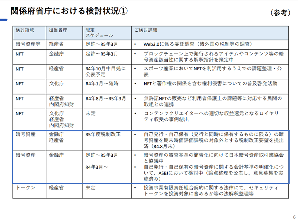 まず金融庁と経産省により令和5年度の税制改正で、自己発行・自己保有(発行と同時に保有する物に限る)の暗号資産を期末時価評価課税の対象外とする税制改正要望が出されています。