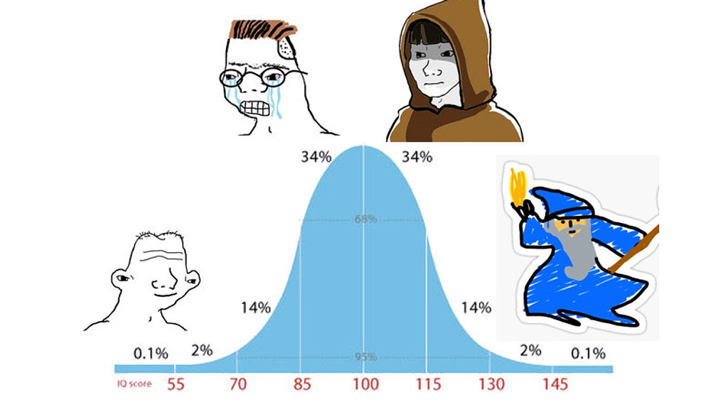 上図は暗号資産界隈で機能しているナラティブの前提を表した(ように筆者には思える)図表です。Fear Is The Mind-Killerというブログで紹介されたこの図表は各投資家、各トレーダーのIQ度合いと全体に占める割合を感覚的に示したものです。ここで触れられているIQとは一般的なそれを指しているわけではなく、貪欲さと恐怖のバランス感覚を指しており、過去の経験や知識によって貪欲さよりも恐怖(損をすると感じる)の方が強い傾向にある人をよりIQが高い人であると仮定して示しています。