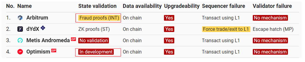 主にArbitrumやOptimismに使われているOptimistic Rollupは、Fraud Proof(虚偽の証明)を行うことでEthereumと同等のセキュリティを担保する予定です。しかし現状では、Arbitrumではホワイトリストで制限された一部のバリデーターのみがFraud Proofを行うことができ、またOptimismではまだ実装がされていません。