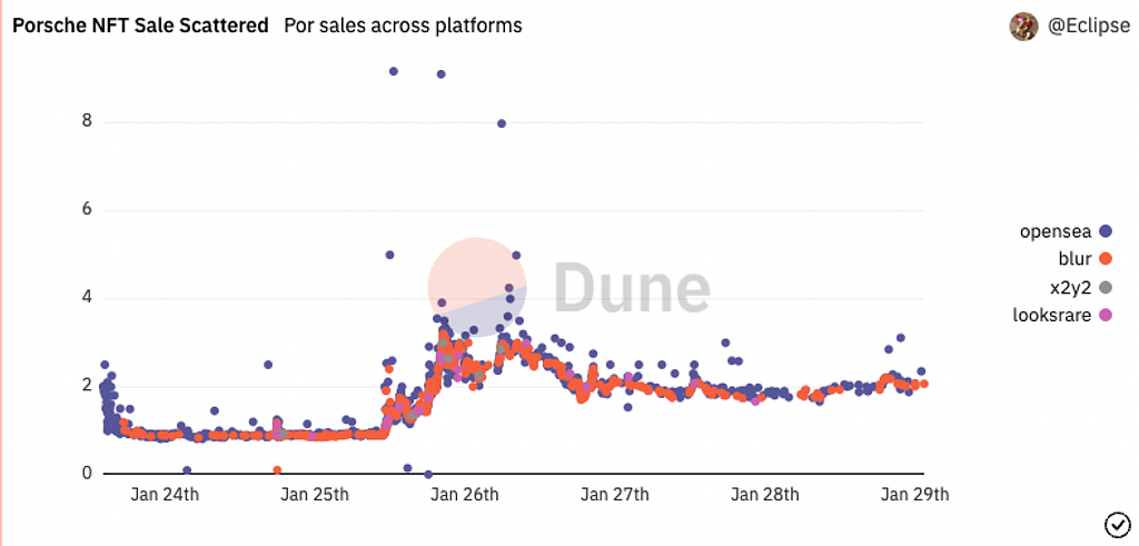 ポルシェNFTの二次販売価格の推移(参照:https://dune.com/Eclipse/por)